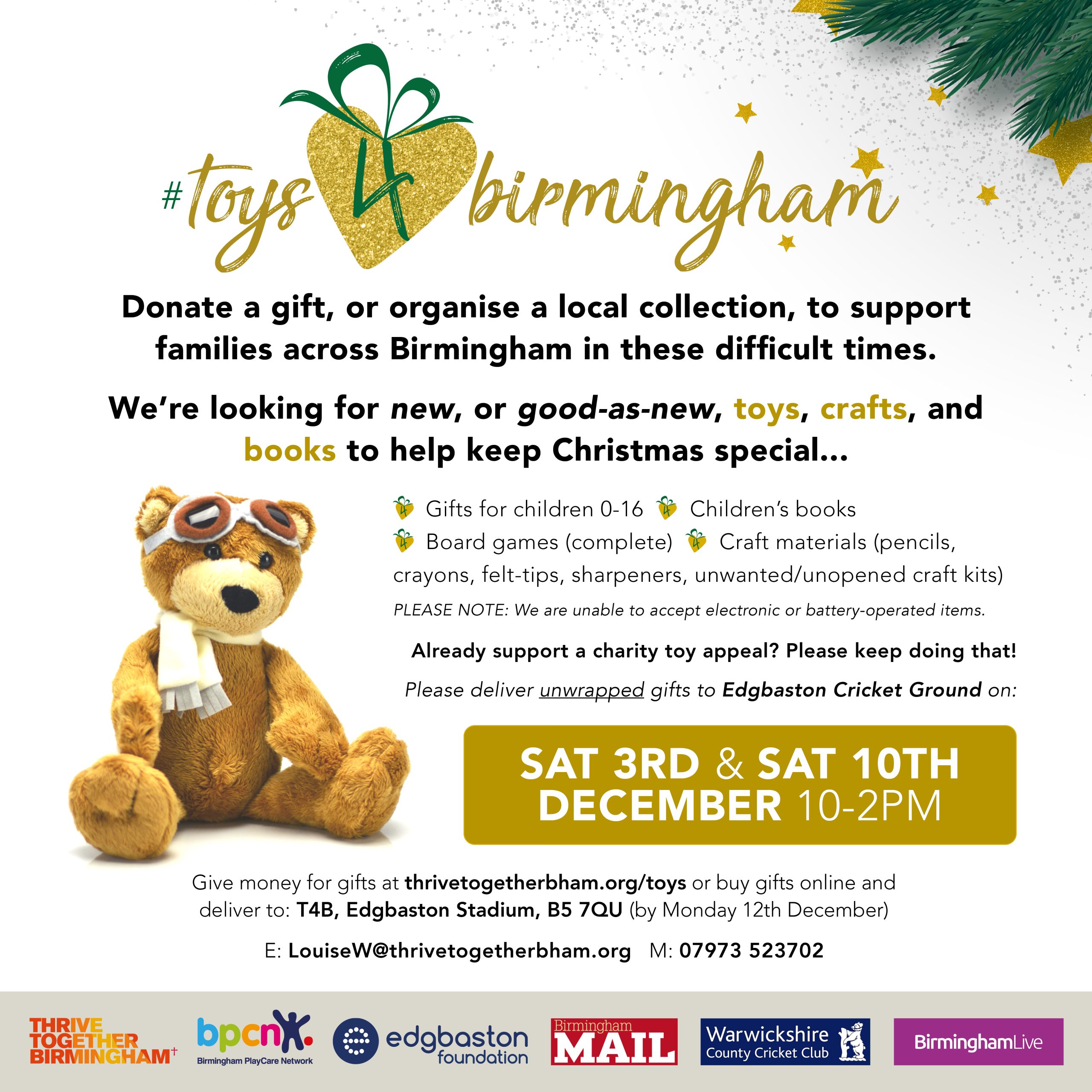 In collaboration with the Birmingham PlayCare Network, the Edgbaston Foundation, the Birmingham Mail, Warwickshire County Cricket Club and Birmingham Live, Thrive Together Birmingham is once again collecting new (or good-as-new) toys, crafts and books to help children aged 0 – 16 in Birmingham. Toys4Birmingham aims to reach every child in temporary accommodation in Birmingham, many … Read more
