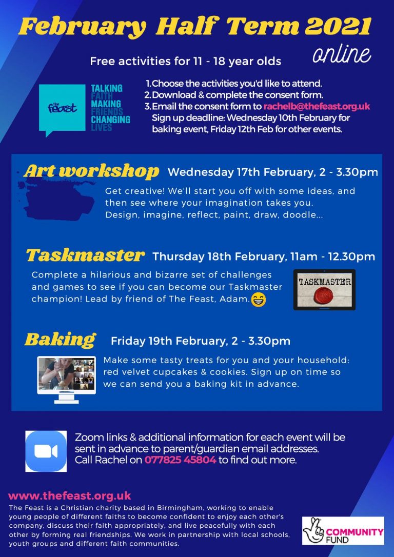 Prior to the Covid-19 lockdown, the interfaith ‘encounter’ events often took place in after-school settings between young people from the city’s Christian, Muslim and Sikh schools. Over the last year, all gatherings have moved online, with a special emphasis on school holidays, when an open invitation is extended to young people to join ‘encounter’ events. Against a backdrop of baking, art and games, discussion starters allow the young people to begin to share about life and faith. Three online events take place during next week’s half-term break – an art workshop on the afternoon of Wednesday 17, ‘Taskmaster’ games on the morning of Thursday 18 and baking on the afternoon of Friday 19 February. Contact Rachel on 07782 545804 to find out more – and be sure to book as soon as possible!