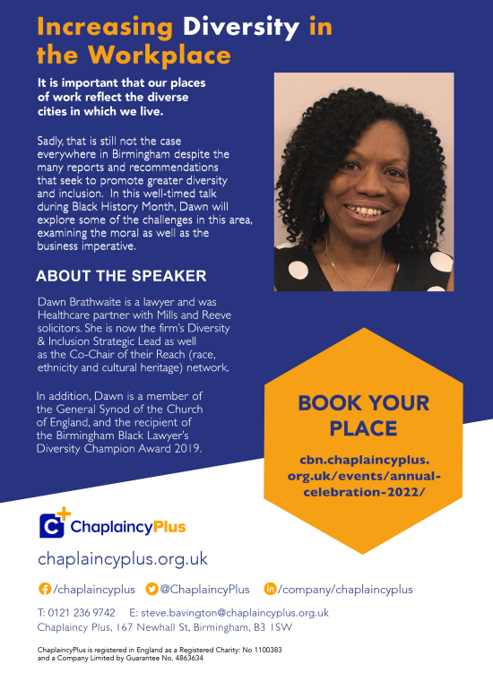 The theme for the 2022 Celebration is ‘Increasing Diversity in the Workplace.’ Diversity is a hot topic at the moment, especially in multi-cultural Birmingham. Quite rightly, there’s a call for greater diversity and inclusion in the workplace. Sadly, this is still not put into practice in every place of work in the city, despite the many reports and recommendations promoting greater diversity and inclusion. It is in the work environment that decisions affecting people of all ethnicities, religions, abilities and sexualities are made. For Christians, a spiritual and moral imperative undergirds their approach to this issue-of-the-moment. The New Testament speaks of the importance of unity in diversity and the gift of love. How should this look in our places of work? And what about the business imperative… Is it one or the other?