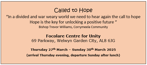The Focolare Community will focus on the 1700th anniversary of the First Council of Nicaea at a special ecumenical conference at the Focolare Centre in Welwyn Garden City from Thursday 27 to Sunday 30 March. ‘Called to Hope‘ will be a chance for Christians from different denominations to celebrate moments of hope together. The programme will include time for prayer and reflection, for listening to each other and for dialogue. There will be opportunities to visit local churches and to pray in St Alban’s Abbey, home of the shrine of England’s first Christian martyr. For further information and booking, follow THIS LINK.