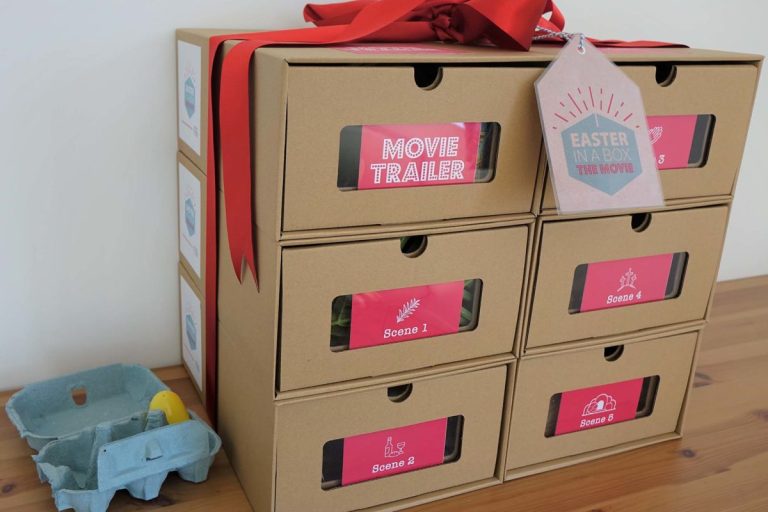 ‘Easter in a Box – The Movie’ is a simple, fresh and imaginative way for churches to share the Easter story with their local schools. Children are invited to imagine that they are on a movie set, watching the filming of ‘Easter – The Movie.’ The movie plot, based on the biblical account of Easter, is revealed to the children as they unpack six boxes, each containing props from a scene in the film.
