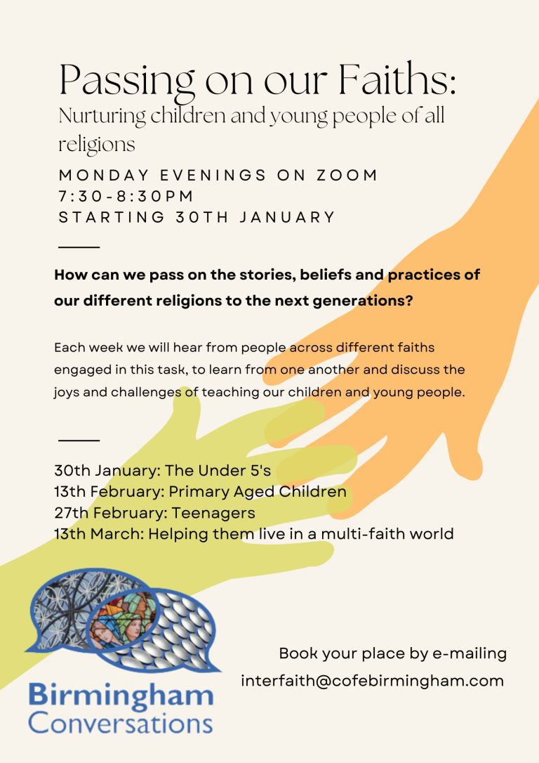 Birmingham Conversations: Passing on our Faiths + Add to Google Calendar + iCal / Outlook export Tags: Birmingham Conversations, Passing on our Faiths Date Feb 13 2023 Expired! Time 7:30 pm - 8:30 pm Category Learning Share this event