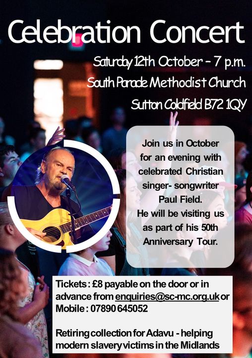 Well-known singer/songwriter Paul Field will be in concert at South Parade Methodist Church, Sutton Coldfield B72 1QY at 7.00pm on Saturday October 12. Paul is celebrating the 50th anniversary of his first album release with a tour of UK Methodist churches. Tickets cost £8 and can be obtained by phoning 07890 645052 or by e-mailing enquiries@sc-mc.org.uk. There will be a retiring collection for Adavu, a project helping modern slavery victims in the Midlands.