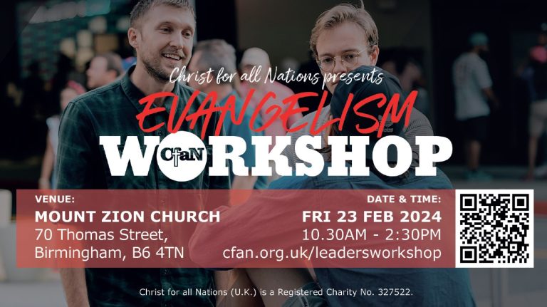 ‘Christ for all Nations’ is running an Evangelism Workshop at Mount Zion Community Church, Thomas Street, Aston B6 4TN, from 10.30am to 2.30pm on Friday (23 February). Further information and free registration via https://cfan.org.uk/leadersworkshop