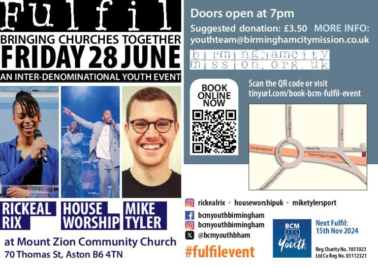 Fulfil Youth + Add to Google Calendar + iCal / Outlook export Tags: Birmingham City Mission, Christian Youth, Fulfil, Fulfil Youth, FulFil Youth Event, Mike Tyler, Rickeal Rix Date Jun 28 2024 Expired! Time 7:00 pm Category Mission & Evangelism Share this event