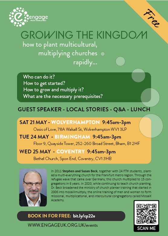 Growing the Kingdom + Add to Google Calendar + iCal / Outlook export Tags: Engage West Midlands, Growing the Kingdom Date May 24 2022 Expired! Time 9:45 am - 3:00 pm Share this event