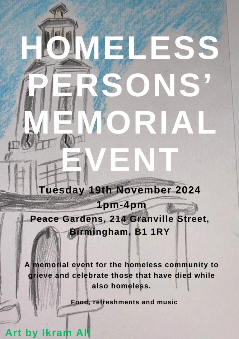 Homeless Persons Memorial Event + Add to Google Calendar + iCal / Outlook export Tags: Birmingham Churches Together, Homeless Persons Memorial Event Date Nov 19 2024 Expired! Time 1:00 pm - 4:00 pm Category Social Justice Standing in the gaps Share this event
