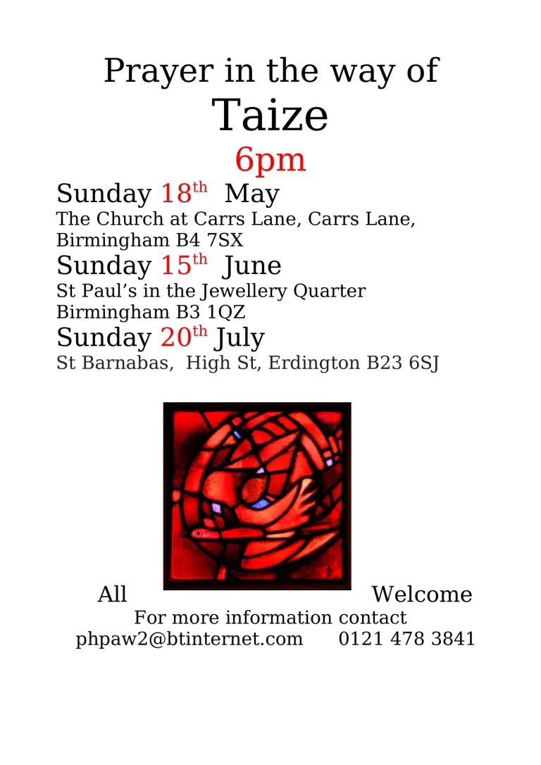 Prayer in the way of Taize + Add to Google Calendar + iCal / Outlook export Tags: prayer, Prayer in the way of Taize Date Jun 15 2025 Expired! Time 6:00 pm Category Prayer Share this event