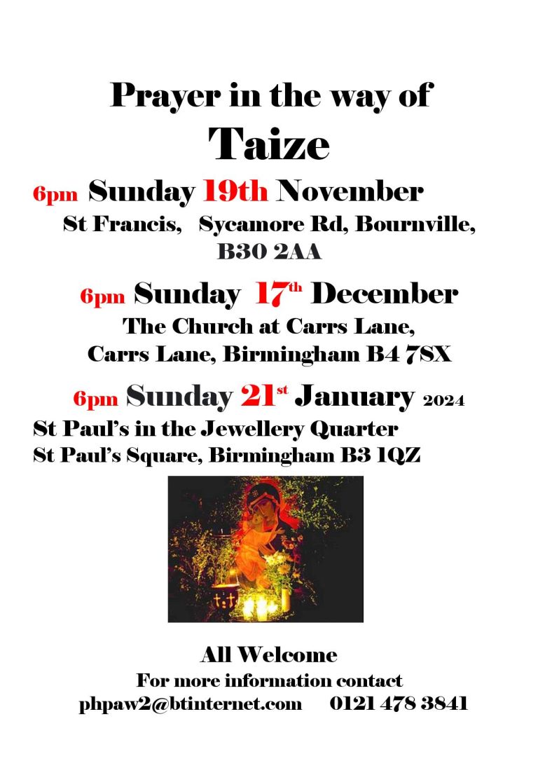 Prayer in the way of Taize + Add to Google Calendar + iCal / Outlook export Tags: Birmingham Churches Together, Prayer in the way of Taize, St Francis, Sycamore Rd, Taize Date Nov 19 2023 Expired! Time 6:00 pm Category Prayer Share this event