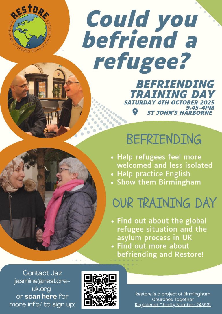 Restore Befriending Training Day + Add to Google Calendar + iCal / Outlook export Tags: Birmingham Churches Together, churches together, Restore, Restore Befriending, Restore Befriending Course Date Oct 04 2025 Expired! Time 9:45 am - 4:00 pm Category Social Justice Standing in the gaps Share this event