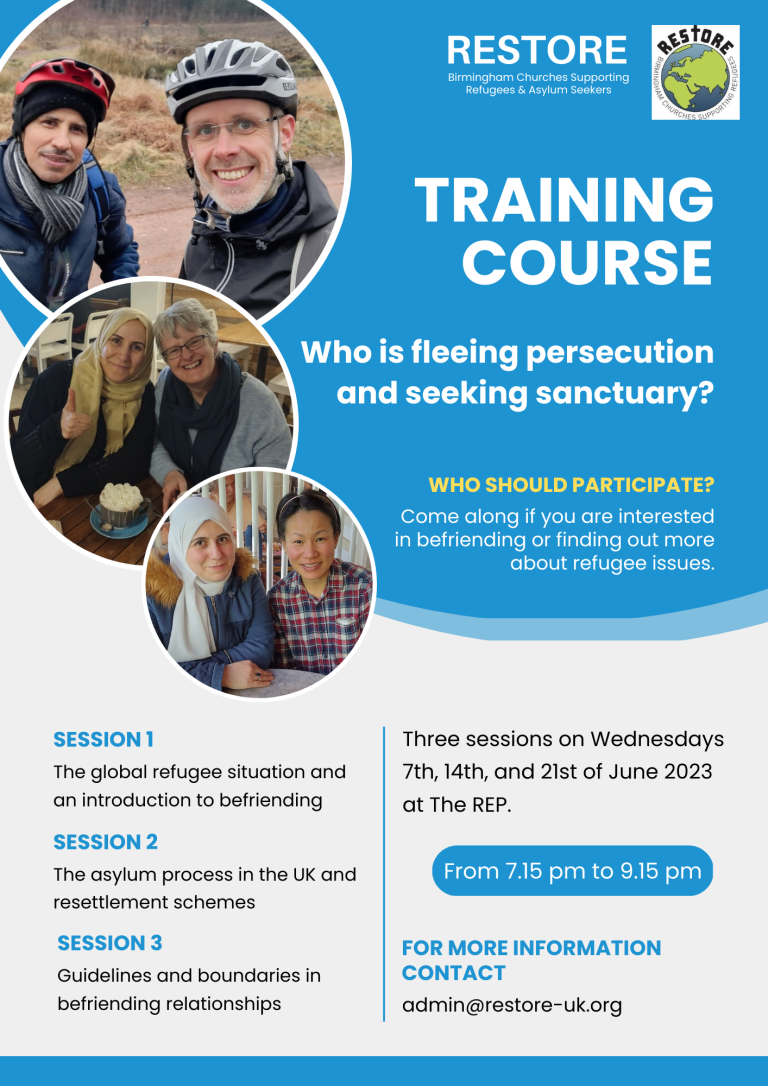 The training is open to anyone who wants to find out more about refugee issues or who wants to explore the possibility of befriending a refugee or asylum seeker through Restore. (All welcome and no obligation to volunteering with Restore at the end.)