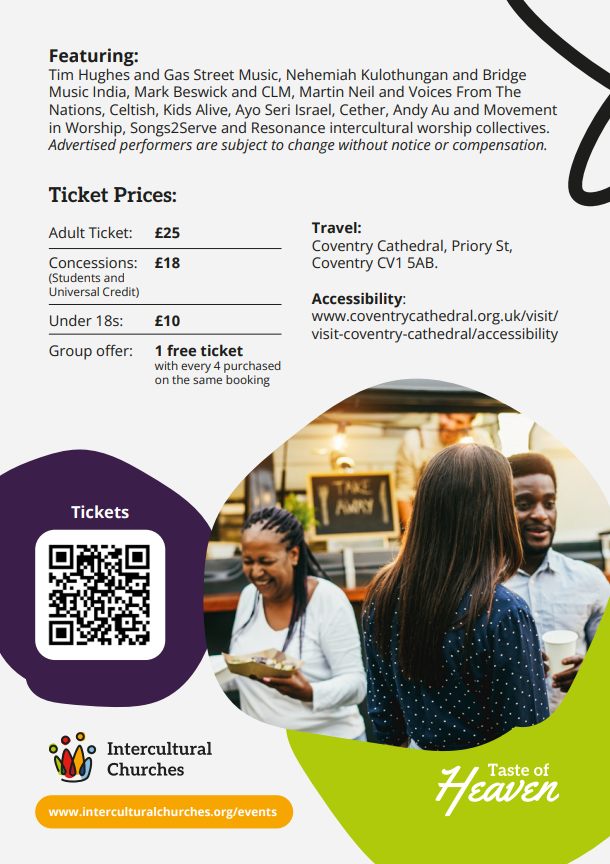 Taste of Heaven: Intercultural Worship Festival + Add to Google Calendar + iCal / Outlook export Tags: Birmingham Churches Together, Christian Unity, Church Unity, churches together, Coventry Cathedral, Intercultural Worship Festival, Taste of Heaven Date May 24 2025 Expired! Time 11:00 am - 8:00 pm Share this event