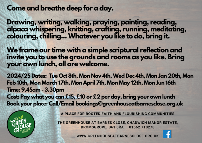 The Greenhouse at Barnes Close: Monthly Retreat Days More information – Events + Add to Google Calendar + iCal / Outlook export Tags: Birmingham Churches Together, Christian Retreats, Retreats, The Greenhouse, The Greenhouse at Barnes Close Date Jun 16 2025 Expired! Time 9:45 am - 3:30 pm Category Prayer Share this event
