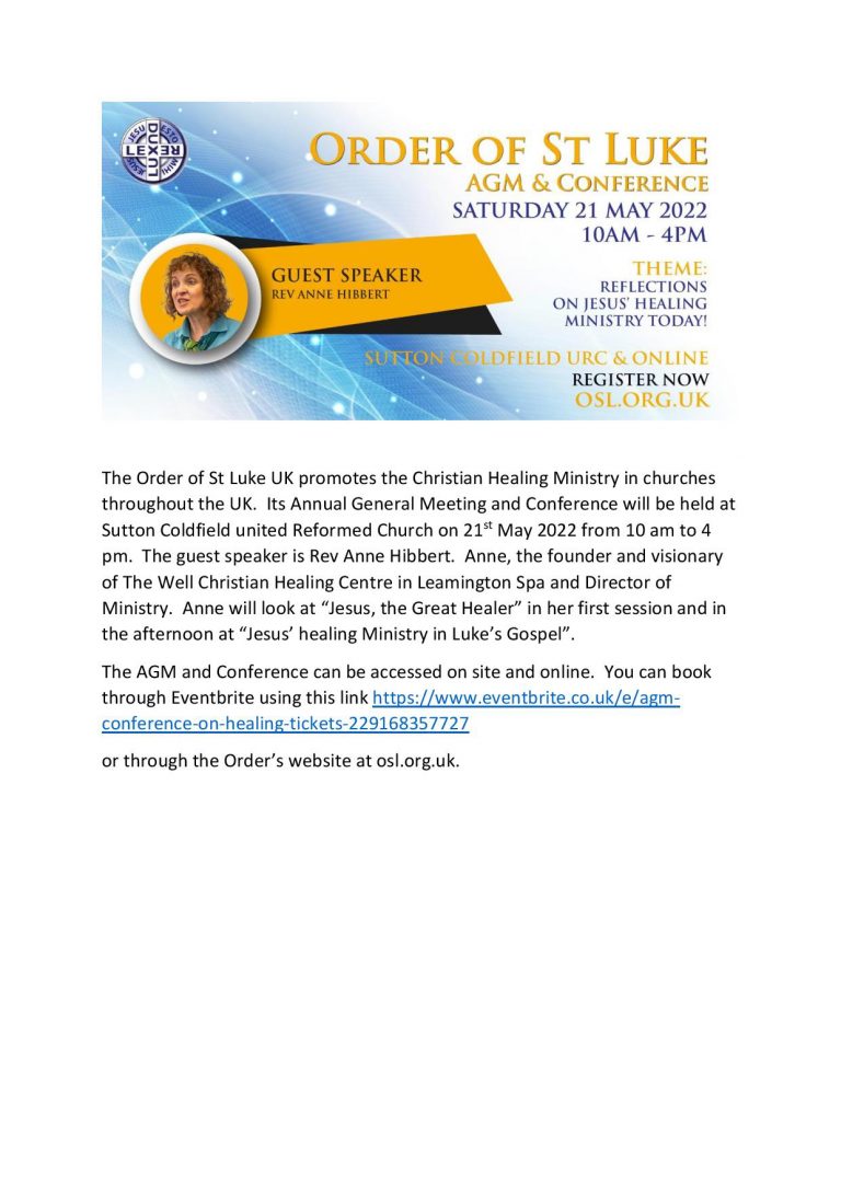The Order of St Luke UK’s annual AGM and Conference will be held at Sutton Coldfield United Reformed Church on 21st May.
