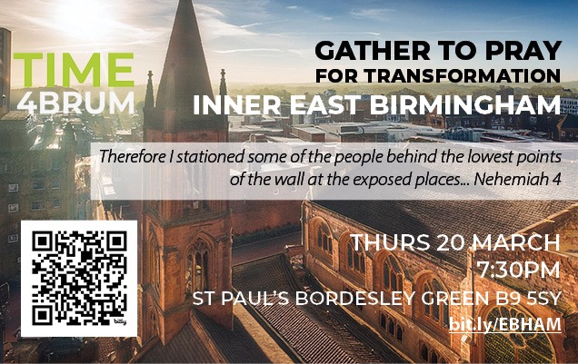 Time4Brum is inviting Christians to pray for the transformation of Inner East Birmingham at a meeting to be held at St Paul’s, Bordesley Green B9 5SY, on Thursday 20 March, beginning at 7.30pm. Information and registration at https://time4brum.uk/so/e4PJBh_hz.