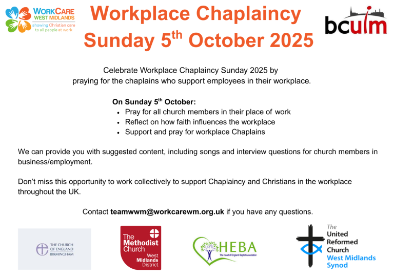 Workplace Chaplaincy Sunday + Add to Google Calendar + iCal / Outlook export Tags: Birmingham Churches Together, Chaplaincy, WorkCare West Midlands, workplace chaplaincy Date Oct 05 2025 Expired! Time All Day Category Workplace Share this event