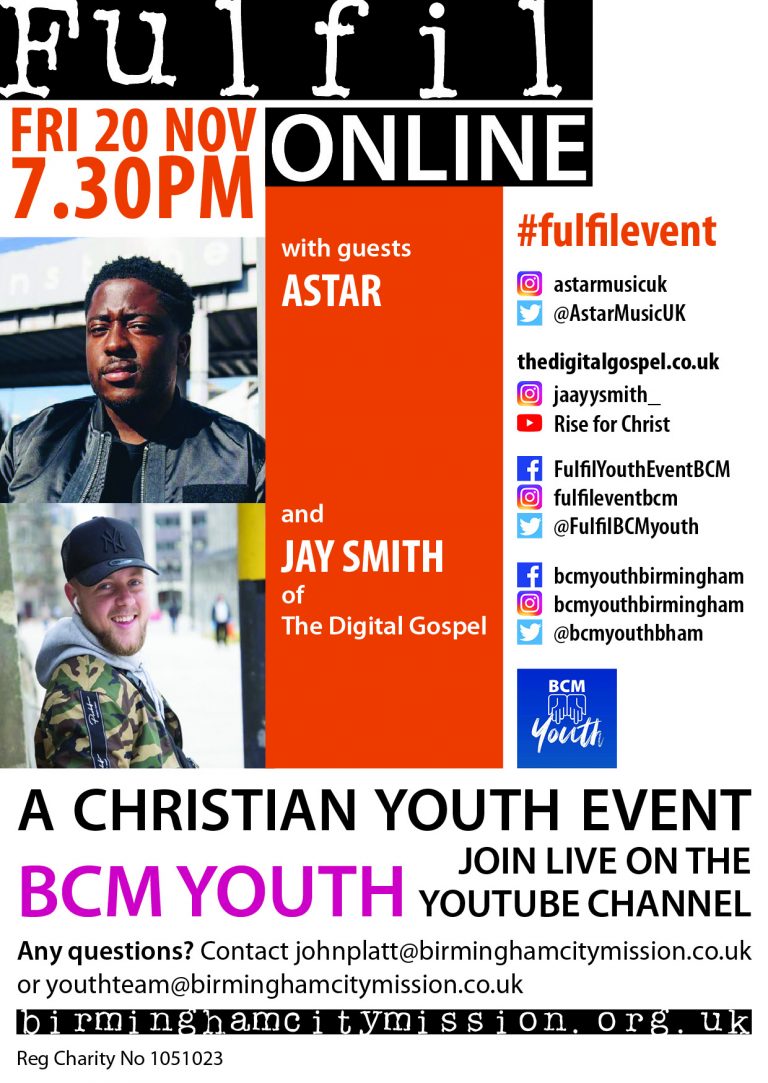 Birmingham City Mission will premiere another ‘Fulfil’ youth event on its ‘BCM Youth’ YouTube channel at 7.30pm on Friday evening, 20 November. BCM is asking the city’s youth group leaders to encourage their young people to invite their friends to join the event, in order to hear about Jesus. BCM is encouraging as much engagement as possible from youth groups during the evening through posting comments on the YoutTube channel. People will need to be logged in to their Google account in order to respond.