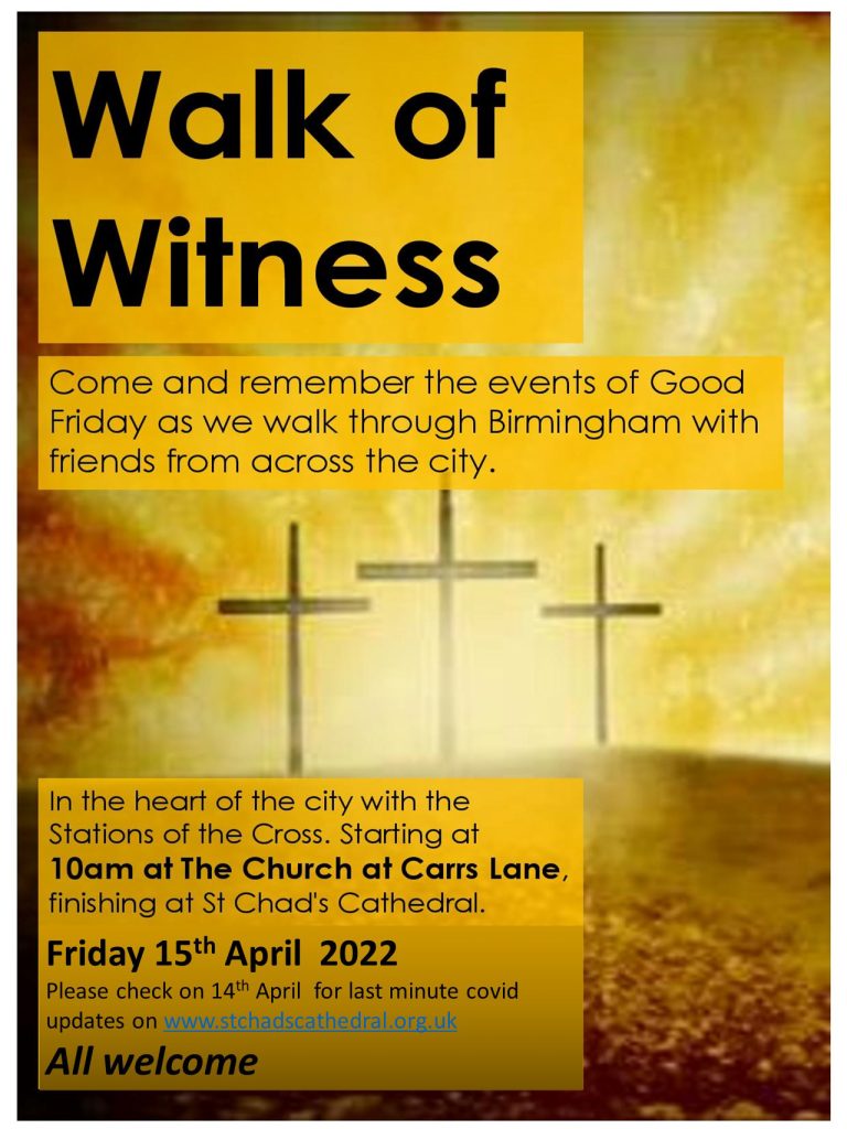 All are welcome to join the ecumenical Walk of Witness in Birmingham City Centre on Good Friday (15 April). The walk starts at 10.00am at The Church in Carrs Lane (Carrs Lane, Birmingham B4 7SX) and finishes at St Chad’s Cathedral (St Chad’s Queensway, Birmingham B4 6EU). During the procession, participants will meditate on the Stations of the Cross, reflecting on two at each pause.