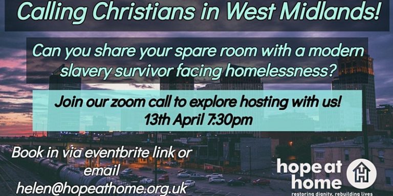 ‘Hope at Home’ is staging an informal meeting via Zoom at 7.30pm next Tuesday, 13 April, to explore what hosting survivors of modern slavery looks like. ‘Hope at Home’ is looking for people with a spare room who might be willing to help slavery survivors who would otherwise be without home and support. Register to attend the informal conversation via THIS LINK.