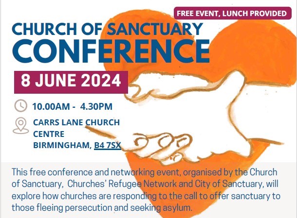 The national CHURCH OF SANCTUARY conference, which will be held at the Carrs Lane Church Centre, Birmingham B4 7SX, from 10.00am to 4.30pm on Saturday 8 June. This free conference and networking event, organised by the Church of Sanctuary, Churches’ Refugee Network and City of Sanctuary, will explore how churches are responding to the call to offer sanctuary to those fleeing persecution and seeking asylum. Join the various workshops on the day to delve deeper into key issues and explore how you, your church or faith organisation, can take action in becoming more welcoming to those in need. Full details and registration via THIS LINK.