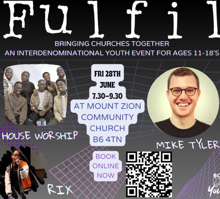 A FULFIL interdenominational youth event for 11s-18s will take place at Mount Zion Community Church, Aston B6 4TN, at 7.30pm on Friday 28 June. Organised by Birmingham City Mission, Fulfil provides an ideal opportunity for young people from different groups and backgrounds to come together to enjoy a fun night out, a chance to see the wider Birmingham Kingdom picture and to be encouraged in faith as young people worship Jesus together and hear and apply the gospel message – which is shared at every event – to their lives. More information about the gathering of 28 June can be found HERE. Register your youth group’s attendance via THIS LINK.