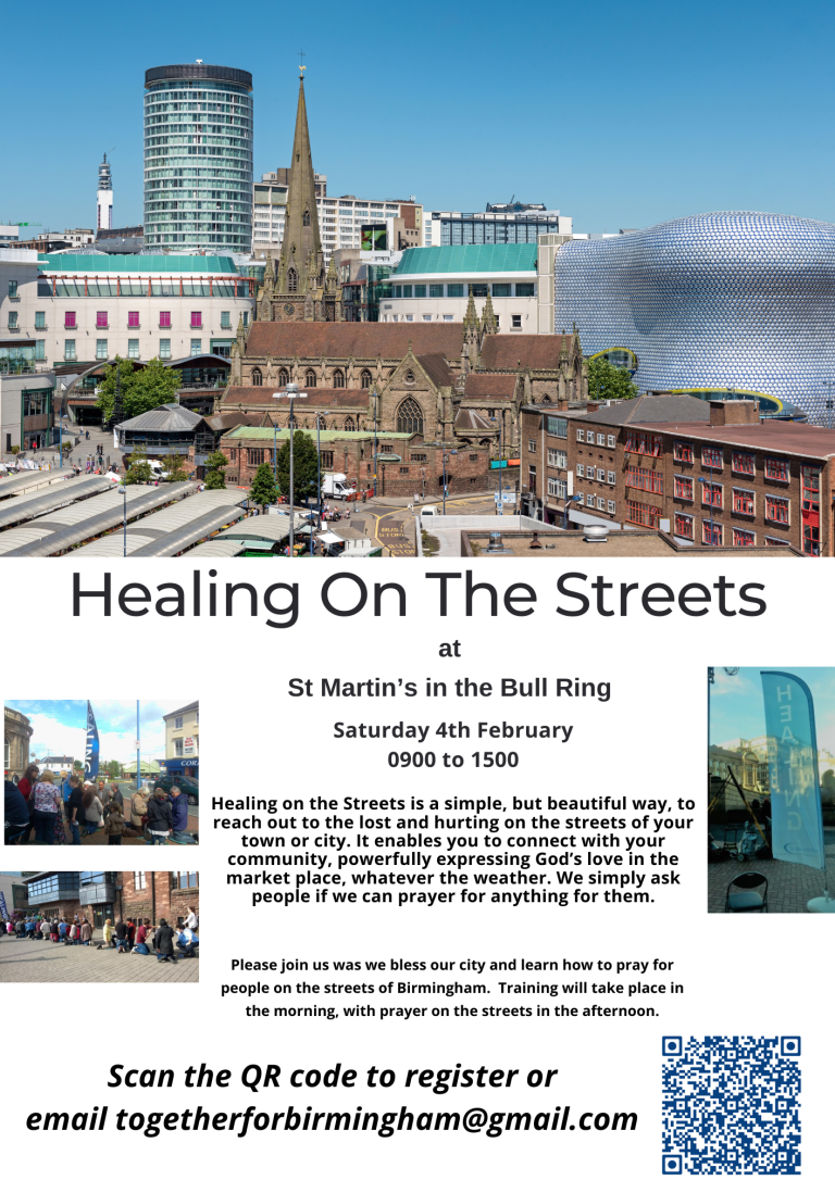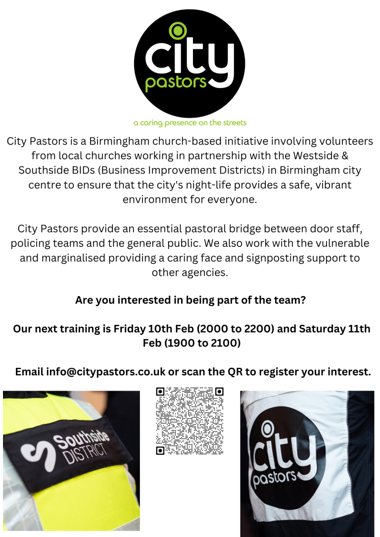 To inspire and equip people for potential involvement, Healing on the Streets is to hold a training day at St Martin in the Bullring from 9.00am to 3.00pm on Saturday 4 February. Register your interest by e-mailing THIS ADDRESS. City Pastors will hold training events from 8.00pm to 10.00pm on Friday 10 February and 7.00pm to 9.00pm on Saturday 11 February. For more information e-mail THIS ADDRESS.