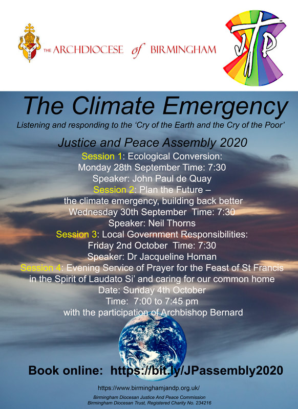 The Birmingham Archdiocesen Justice & Peace Assembly 2020 will take place online, consisting of three one-hour evening sessions, plus Evening Prayer to conclude the virtual gathering. The 7.30pm weekday evening sessions will take place on Monday 28 September, Wednesday 30 September and Friday 2 October. Evening Prayer will be led by Archbishop Bernard Longley at 7.00pm on Sunday 4 October, the Feast of St Francis of Assisi.