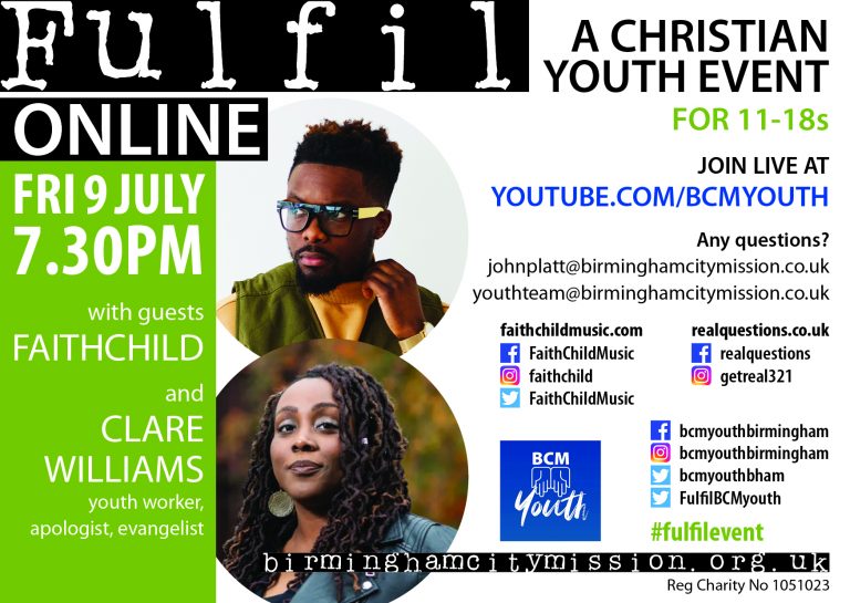 For an introduction to ‘Fulfil’ events, click HERE to watch the short video, ‘What’s Fulfil all about?’ Find out more about Birmingham City Mission’s youth team HERE. Watch the ‘Fulfil’ event of Friday 12 March via THIS LINK.