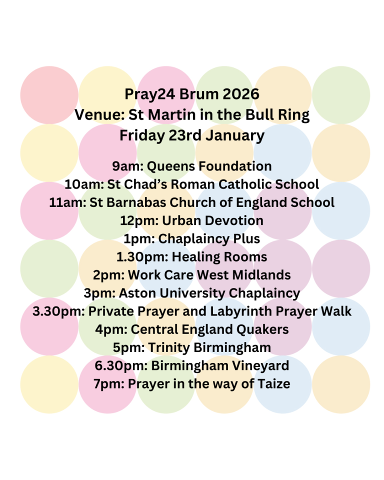 Pray24Brum is an opportunity to begin the New Year praying together with other Christians for our city. Pray24Brum will next take place on the 23rd and 24th January 2026 and will be hosted by St Martin in the Bull Ring. We hope you will join us in prayer, come when you can, leave when you must. The full schedule is available here: We shall be live streaming sessions on our YouTube Channel. We hope you will join us in person or online for some or all of our prayer together.