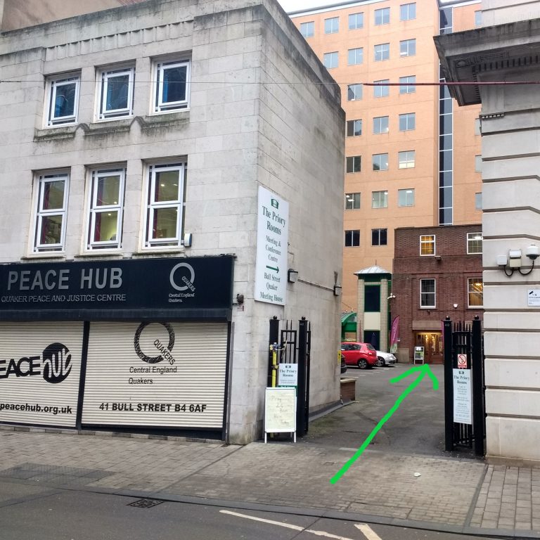 The Quaker Meeting House is in Upper Bull Street close to the Tram Stop and not far from Snow Hill Station.