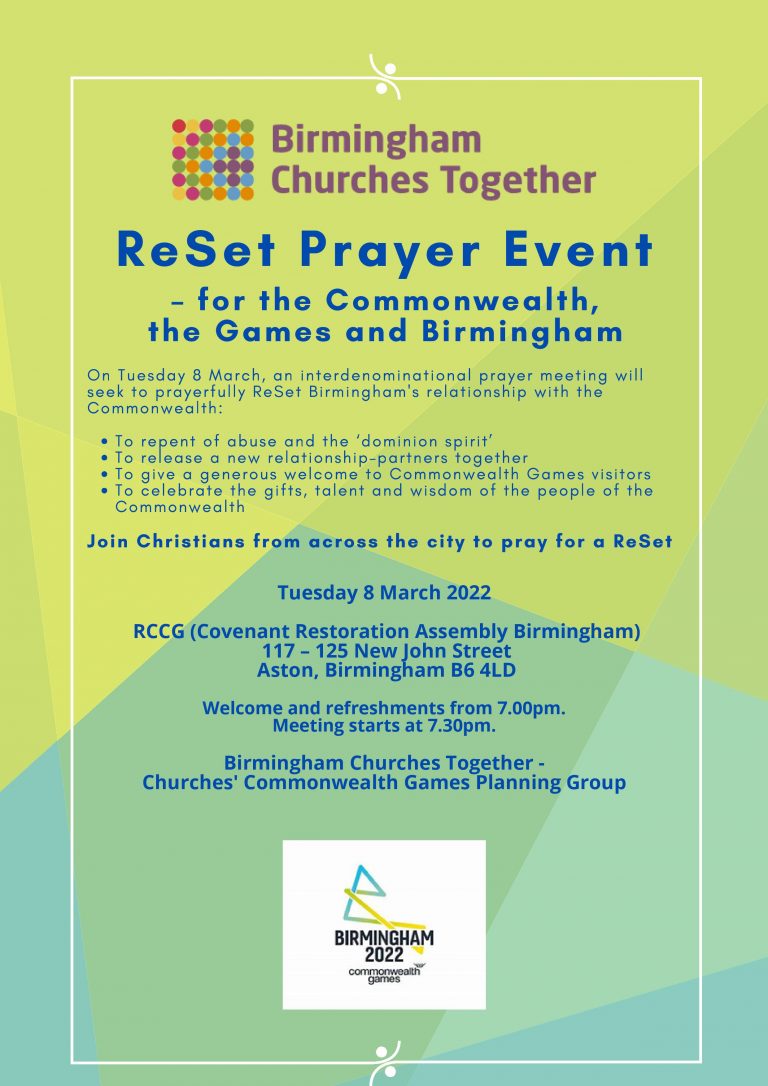 The Commonwealth of Nations is a voluntary association of 54 independent and equal countries in Africa, Asia, the Americas, Europe and the Pacific, not counting smaller territories and domains. It is home to one-third of the world’s population and includes both advanced economies and developing countries. The ReSet prayer meeting of 8 March is part of the ongoing preparations being undertaken by midlands Churches for the 2022 Commonwealth Games, which will take place in Birmingham, Coventry, Warwick, Smethwick and Wolverhampton between Thursday 28 July and Monday 8 August. For more information about those plans, click HERE.