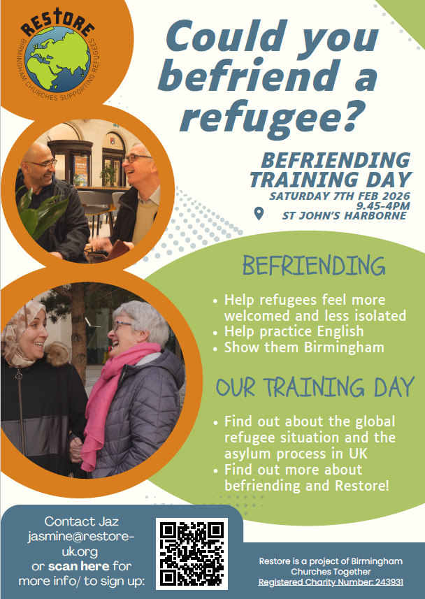 The next Refugee Befriender Training Course from ‘Restore’ will be held at St John’s Church, High Street, Harborne B17 9PT, on Saturday 7 February 2026. The course is for anyone interested in learning more about refugees, and those considering volunteering as a befriender with Restore.