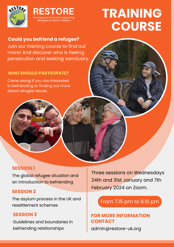 Restore, is a project of Birmingham Churches Together and our vision is for a society into which all refugees and asylum seekers are welcomed, valued and integrated. In a hostile environment, we aim to be countercultural and respond to Jesus’s call to welcome the stranger. Welcome is offered through one-to-one befriending and group social activities. Volunteer befrienders become a bridge between the host community and the new arrival, combat isolation and assist with conversational English – all helping with integration.