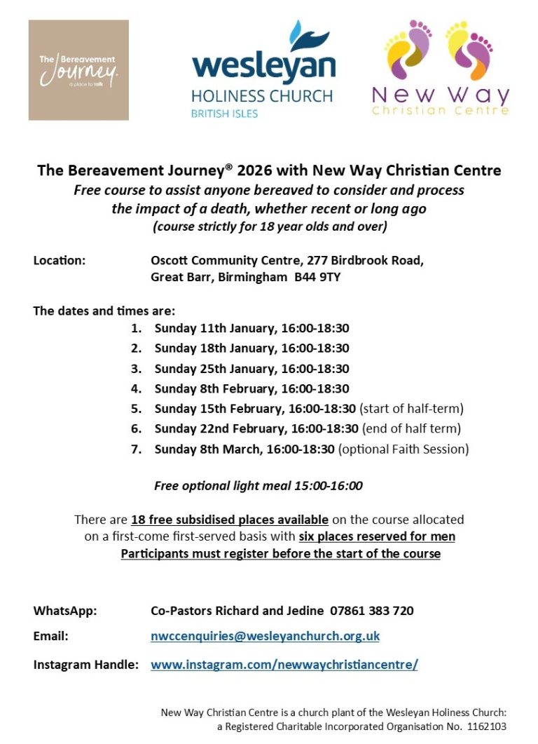 Read more about ‘The Bereavement Journey’ course via THIS LINK and watch a short video about the course HERE. For more information about The Bereavement Course at NewWay Church, e-mail THIS ADDRESS or phone 07861 383720.