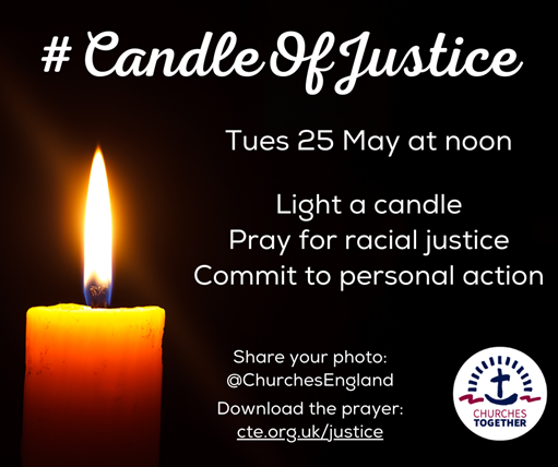 initiative at 12noon on Tuesday. At midday, people are invited to pause for one minute to remember George Floyd and all who experience racism, to light a candle (or torch), pray the ‘Candle of Justice’ prayer, make a personal commitment to tackle racial injustice and upload a candle to social media, using the hashtag #CandleofJustice and tag @ChurchesEngland. More information via THIS LINK.