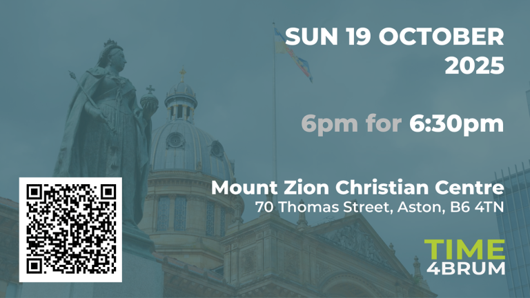 The annual celebration service of the Christian unity group Time4Brum will take place at Mount Zion Christian Centre, 70 Thomas Street, Aston B6 4TN, at 6.30pm on Sunday 19 October. All are invited to respond to the call to join Christians of different denominations and generations across the city to seek the Lord’s blessing on Birmingham. The service will include sung worship, testimony and prayer.